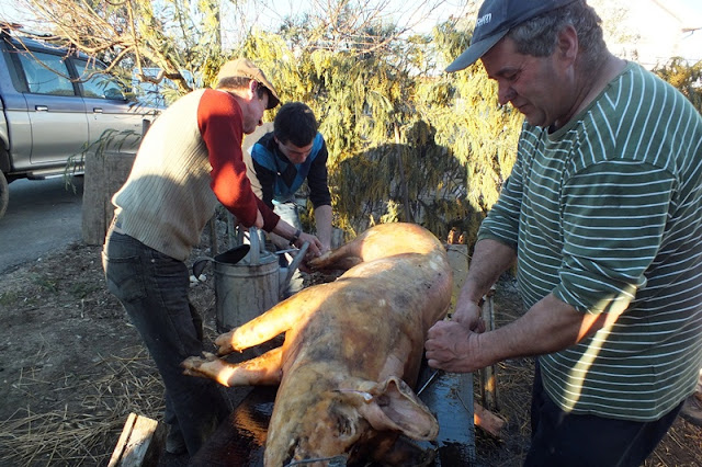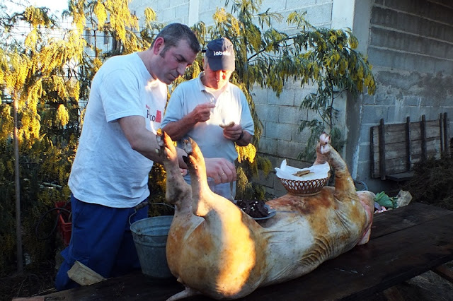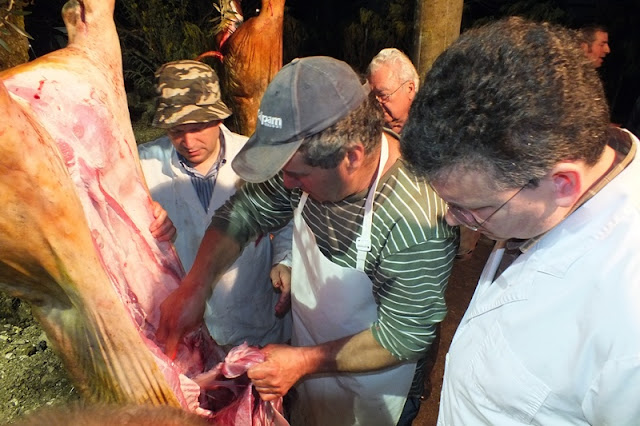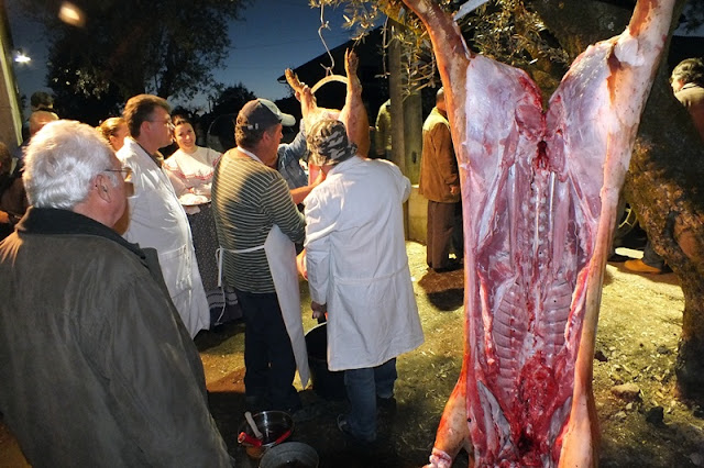 Cortada a tira da barriga de cada porco, foram os mesmos içados e pendurados em pernadas de uma oliveira a fim de lhes ser retirado o bandulho e a fressura e de serem preparados para recolha a uma loja, onde ficaram guardados até à desmancha na manhã de domingo.