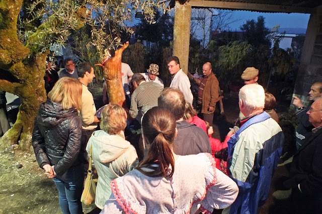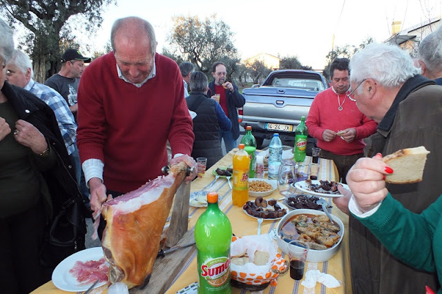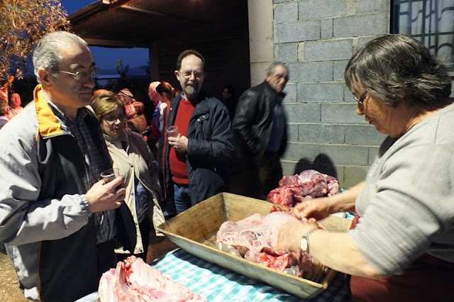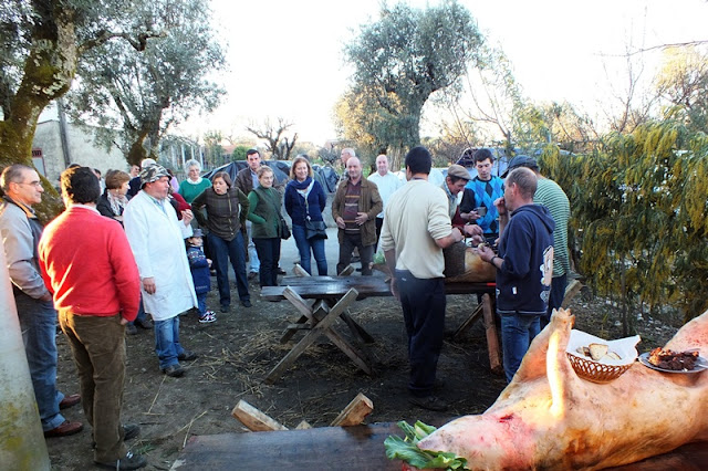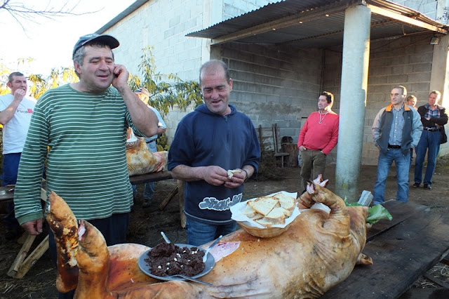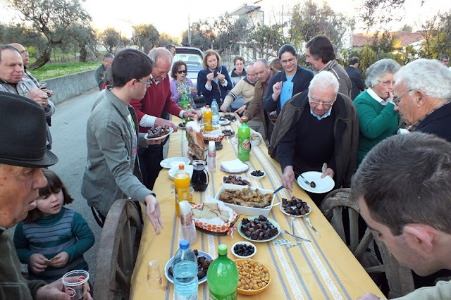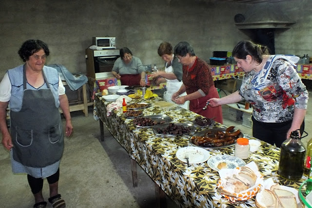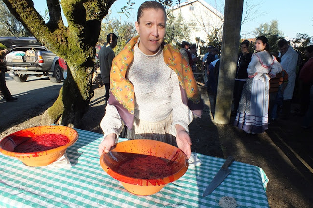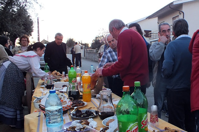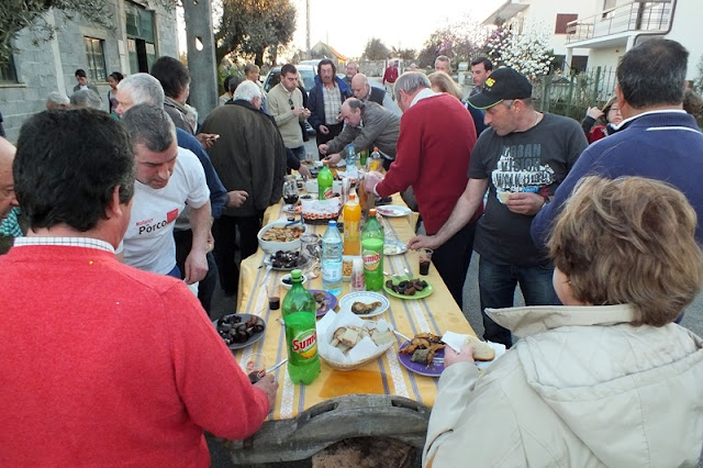 Ao lado, o leito de um carro de bois serviu de mesa para o lanche partilhado por todas as pessoas que presenciavam a matança, onde a fartura e a diversidade de petiscos incluíam sangue cozido, presunto, enchidos cozidos, peixe do rio frito, queijo, tremoços, pão, bolos e bebidas à escolha.