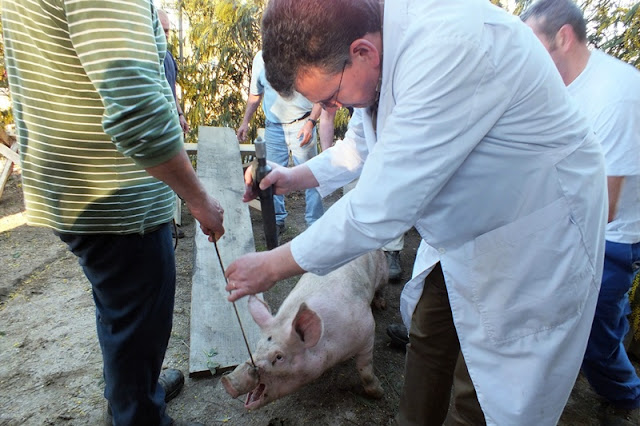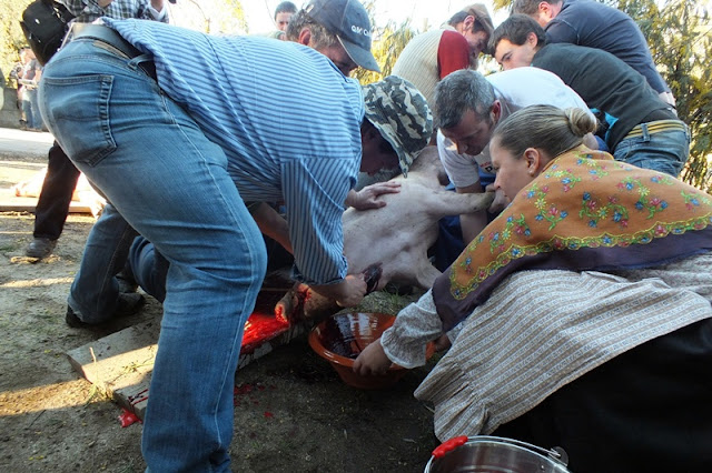 Tirando a intervenção do veterinário municipal com o disparo de um fulminante na cabeça de cada animal para lhes minorar o sofrimento, todos os passos seguintes se enquadraram na preservação da tradição da matança à moda antiga, passando pela sangria dos animais; pela recolha do sangue em alguidares de barro, preparados com sal em cruz e segurados por elementos femininos do rancho trajados a rigor; pelo estonar dos porcos, com queima de carqueja e palha de centeio; pela raspagem e lavagem dos corpos; e pelo degustar da “bucha” em cima dos mesmos.